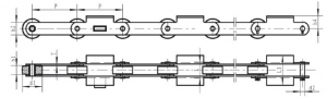| Chain no. | Pitch P1 (mm) | Inner width of inner link b1 (mm) | Diameter of roller d1 (mm) | Diameter of pin d2 (mm) | Length of pin L (mm) | Height of sidebar h2 (mm) | Thickness of sidebar T (mm) | Width of attached plate L1 (mm) | Tensile strength Q (KN) |