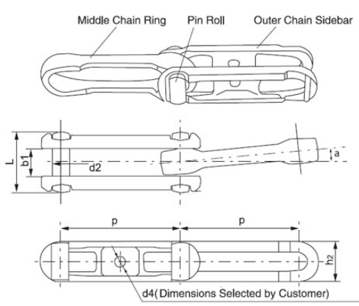 | Standard | Chain No. | Reference pitch P (mm) | Diameter of pin d2 (mm) | Length of pin L (mm) | Standard length (min/max) (mm) | Number of pitch within standard length | Sideward bending angle α (°) | Width of sidebar h2 (mm) | Tensile strength (KN) | Weight per meter (kg/m) |