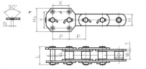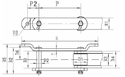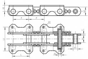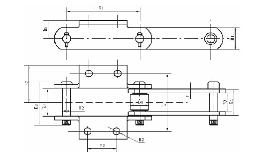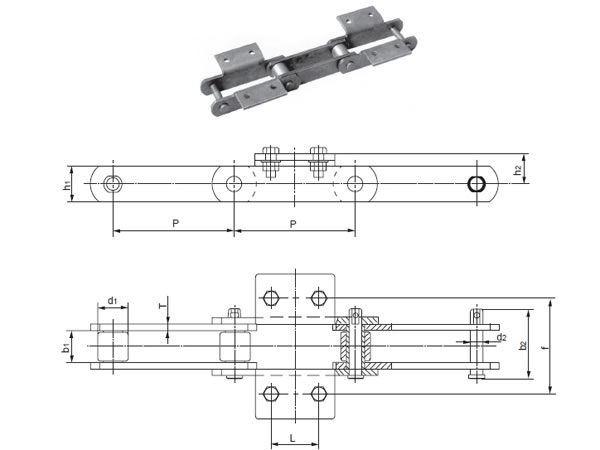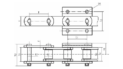 Chain No.Pitch P (mm)Inner width of inner link b1 (mm)Diameter of roller d1 (mm)Diameter of pin d2 (mm)Height of sidebar h2 (mm)Thickness of sidebar T (mm)Hole height of attached plate (mm)Central distance of attached plate L1(mm)Hole diameter of attached plate d4 (mm)Tensile