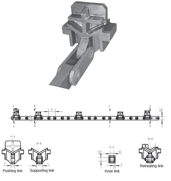Pitch P (mm)Inner width of inner link b1 (mm)Diameter of roller d1 (mm)Diameter of pin d2 (mm)Length of pin L (mm)Height of sidebar h2 (mm)Thickness of sidebar T (mm)Height of attached plate H2 (mm)Tensile strength Q (KN)