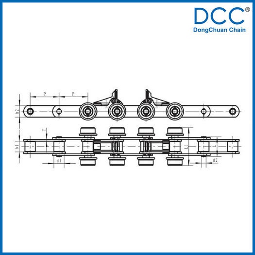 | Pitch P (mm) | Inner width of inner link b1 (mm) | Diameter of roller d1 (mm) | Diameter of pin d2 (mm) | Length of pin L (mm) | Height of sidebar h2 (mm) | Thickness of sidebar T (mm) | Height of attached plate H2 (mm) | Tensile strength Q (KN) |