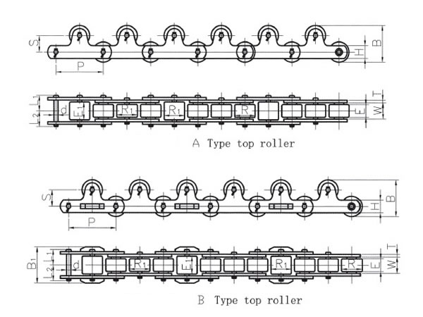 Chain No.Pitch P (mm)RollerInner width W (mm)SidebarPinS (mm)Top rollerb (mm)b1 (mm)Allowable working load of top rollerTensile strength (KN)A type weight (kg/m)B type weight (kg/m)Attachment weight (kg)